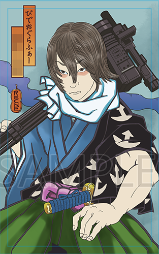 三脚付きビデオカメラを肩に担いだ、凛々しい武者の似顔絵です。